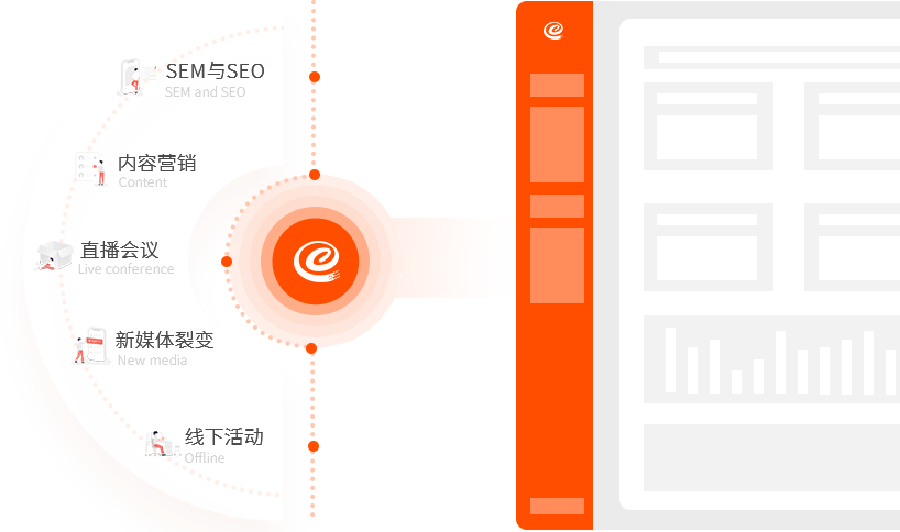 集成搜索引擎SEM、SEO、內容營銷、直播、新媒體裂變、線下活動等營銷工具,助力企業(yè)大數(shù)據(jù)獲客;